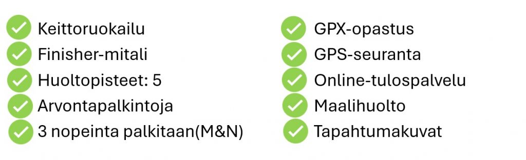 GPX-opastuksen mahdollistava laite, GPS-seuranlaite(tulee järjestäjältä), puhelin(täyteen ladattu ja aina päällä), itsekiinnittyvä tukiside, juomapullo/rakko(min 1,5l), varaenergiaa, muki(juomapisteillä ei mukeja).
